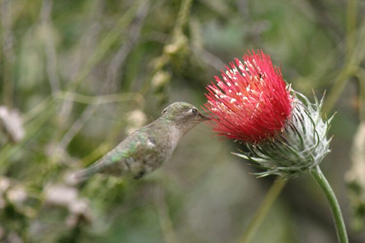Annas hummingbird (Calypte anna) feeding on Venus thistle